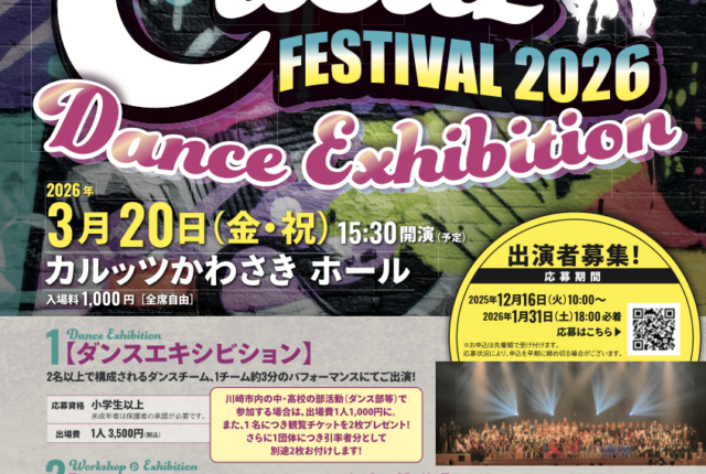 2023年3月の開催から毎年3月に開催されているカルッツかわさきがおくる総合文化祭、Culttz Festival!ホールで行われるダンスエキシビジョンでは、地元川崎の中高のダンス部や、一般公募のダンスチームが中心となって、白熱のステージを披露!